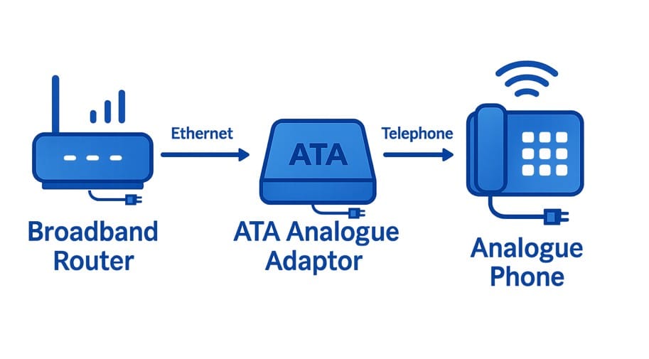 Connect the supplied analogue phone adapter to an unused port on your broadband router using the supplied ethernet cable, connect your old phone to the phone port on the adapter, lastly connect the supplied power supply to the analogue phone adapter and plug it into the nearest mains wall socket.